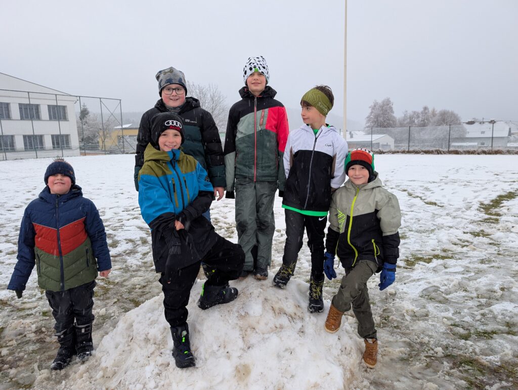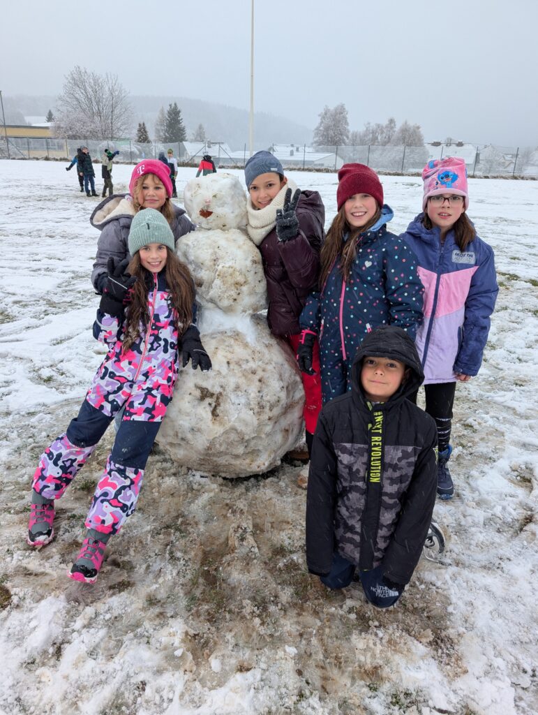 Auch in den Pausen herrscht große Begeisterung: Die Kinder freuen sich über den frischen Schnee, bauen Schneemänner und nutzen die weißen Wiesen für fröhliches Spielen im Freien.